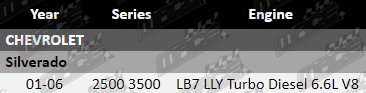 This filter service kit suits Chevrolet Silverado fitted with LB7 and LLY Turbo Diesel V8 engines.