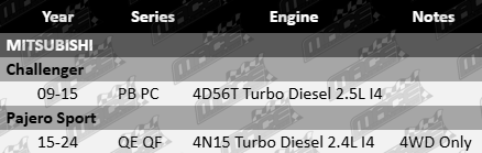 This set of brake pads suits Mitsubishi vehicles fitted with 4D56T and 4N15 Turbo Diesel I4 engines.