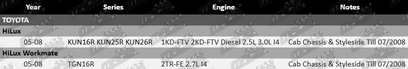 This heavy-duty tow bar kit suits Toyota vehicles fitted with 2TR-FE, 1KD-FTV and 2KD-FTV Turbo Diesel I4 engines.